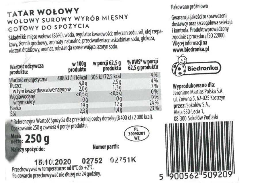 Główny Inspektor Sanitarny wydał kolejne ostrzeżenie publiczne dotyczące żywności. Tym razem dotyczy ono wykrycia Escherichia coli wytwarzających toksynę Shiga w tatarze wołowym "Kraina mięs", sprzedawanym  w Biedronce.