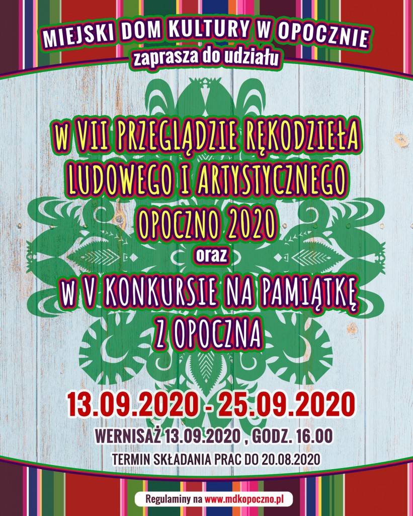 Miejski Dom Kultury w Opocznie zaprasza do udziału w VII Przeglądzie Rękodzieła Ludowego i Artystycznego połączonego z jubileuszową - piątą już edycją - Konkursu na Pamiątkę z Opoczna.