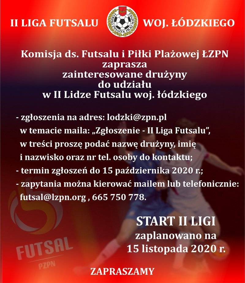 Do 15 października 2020 będą przyjmowane zgłoszenia drużyn zainteresowanych występami w wojewódzkiej II lidze futsalu. Inauguracja rozgrywek jest zaplanowana na 15 listopada 2020.