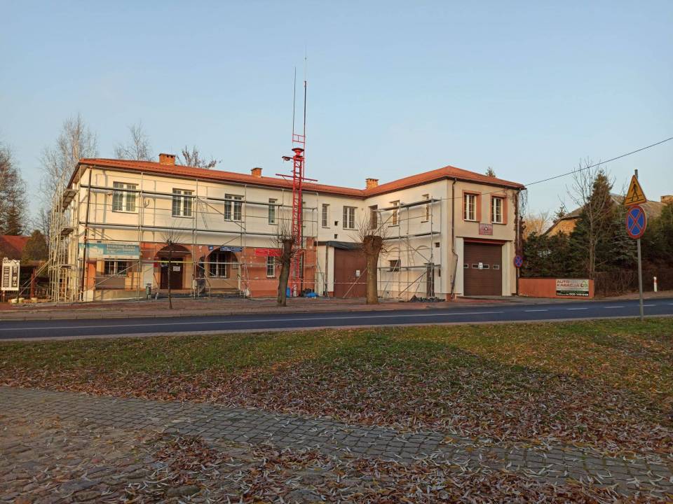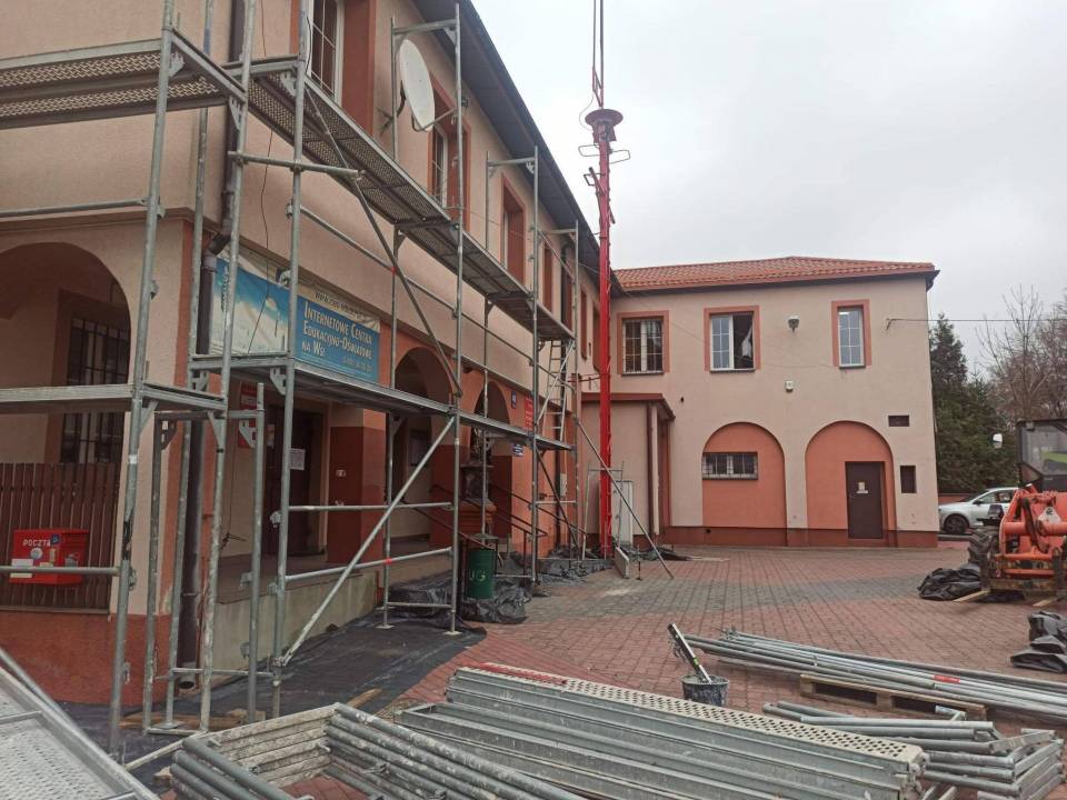 - Remont elewacji budynku Gminnego Ośrodka Kultury i OSP w Poświętnem. Prace remontowe to głównie malowanie elewacji, ale również naprawa ubytków w tynku, instalacji odgromowej oraz rynny spustowej, a także obróbki blacharskie.