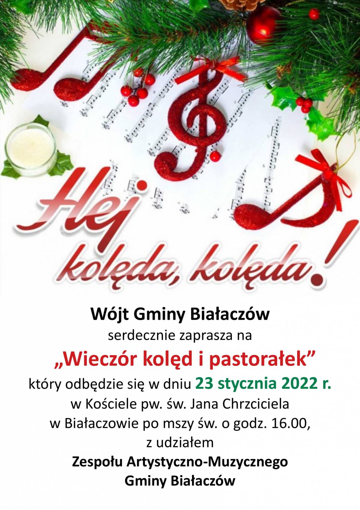Wójt Gminy Białaczów zaprasza na Wieczór kolęd i pastorałek "Hej kolęda, kolęda", który odbędzie się w niedzielę, 23 stycznia.
