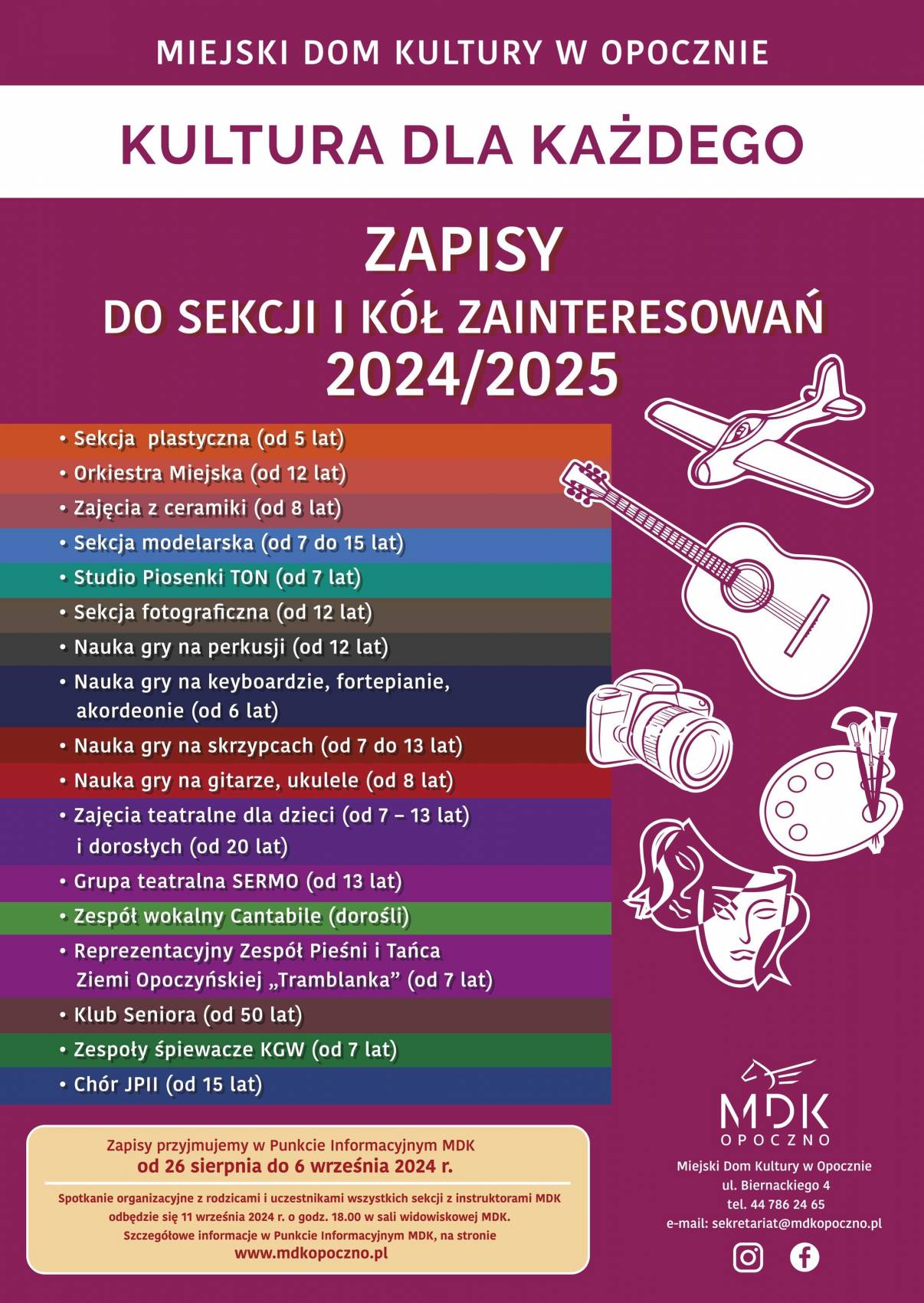 Jeśli chcesz rozwijać swoje pasje lub odkrywać nowe talenty to ta propozycja jest dla Ciebie! Miejski Dom Kultury im. T. Sygietyńskiego w Opocznie serdecznie zaprasza dzieci, młodzież i dorosłych do sekcji i kół zainteresowań w roku artystycznym 2024/2025.