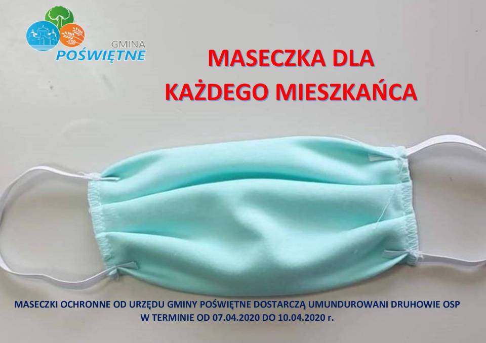 W trosce o zdrowie i bezpieczeństwo mieszkańców, Wójt Gminy Poświętne podjął decyzję o zakupie masek ochronnych dla wszystkich mieszkańców gminy. Są to uniwersalne, dwuwarstwowe, maseczki wielokrotnego użytku, które można prać. Maseczki będą dostarczane bezpośrednio do każdej posesji przez druhów OSP.