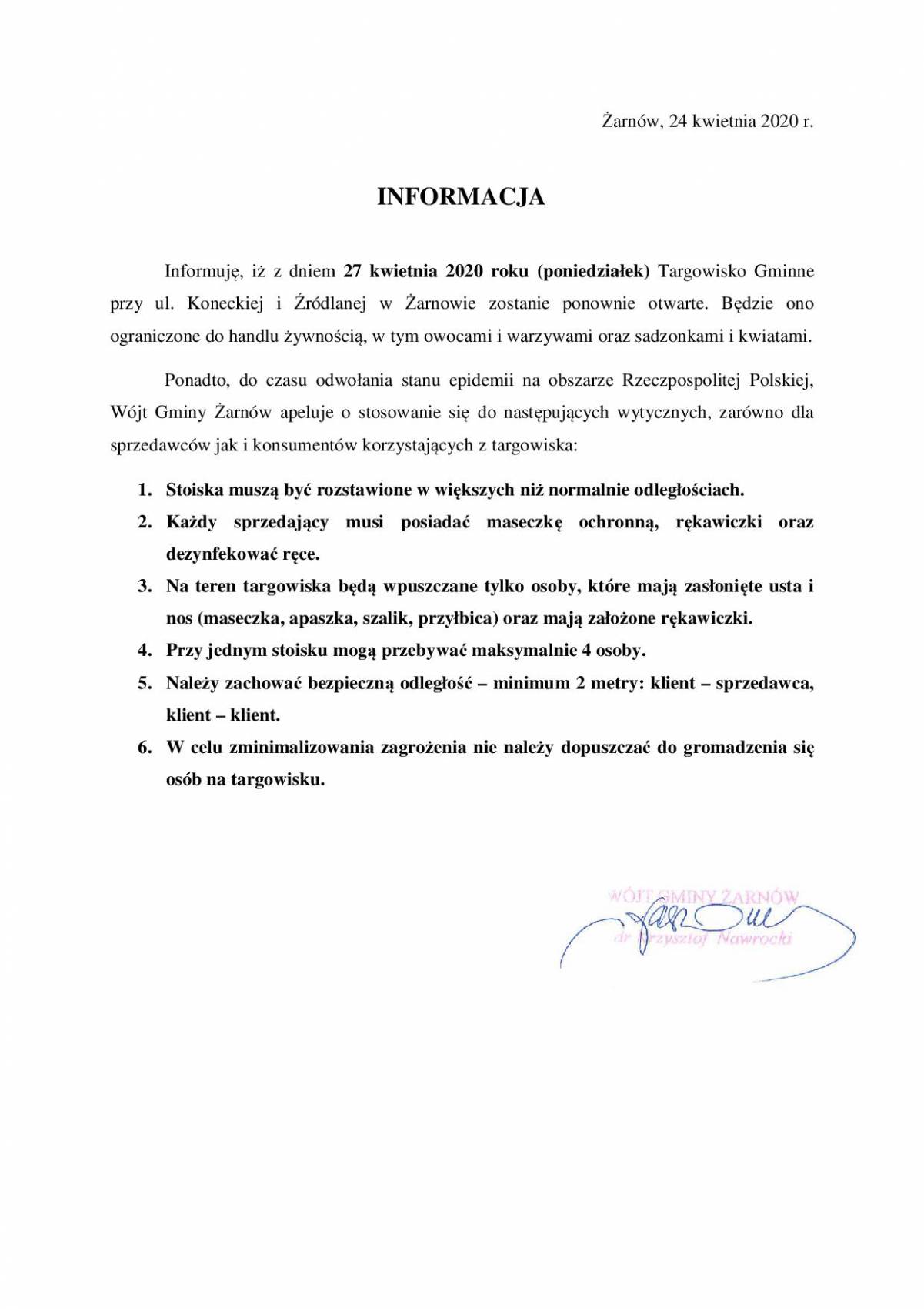 Wójt Gminy Żarnów zadecydował o ponownym otwarciu Targowiska Gminnego przy ul. Koneckiej i Źródlanej w Żarnowie.