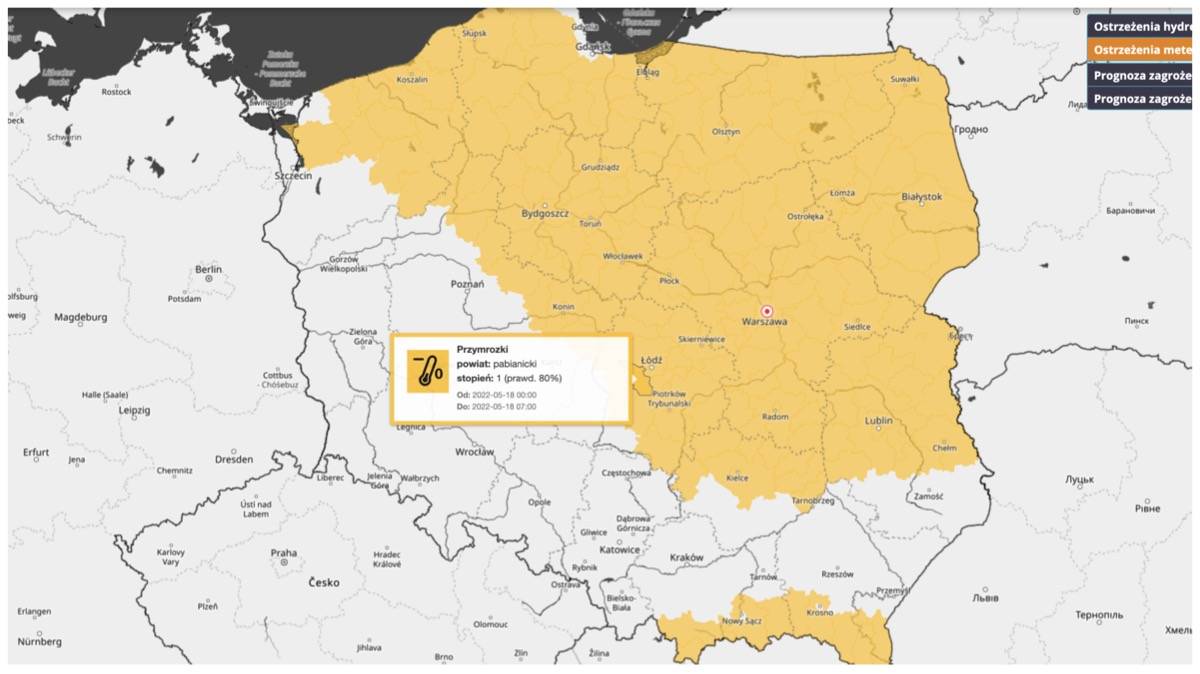 Ostrzeżenie obowiązuje od północy do 7.00 rano w środę, 18 maja. Wystąpienie takich zjawisk pogodowych meteorolodzy określili na 80%.