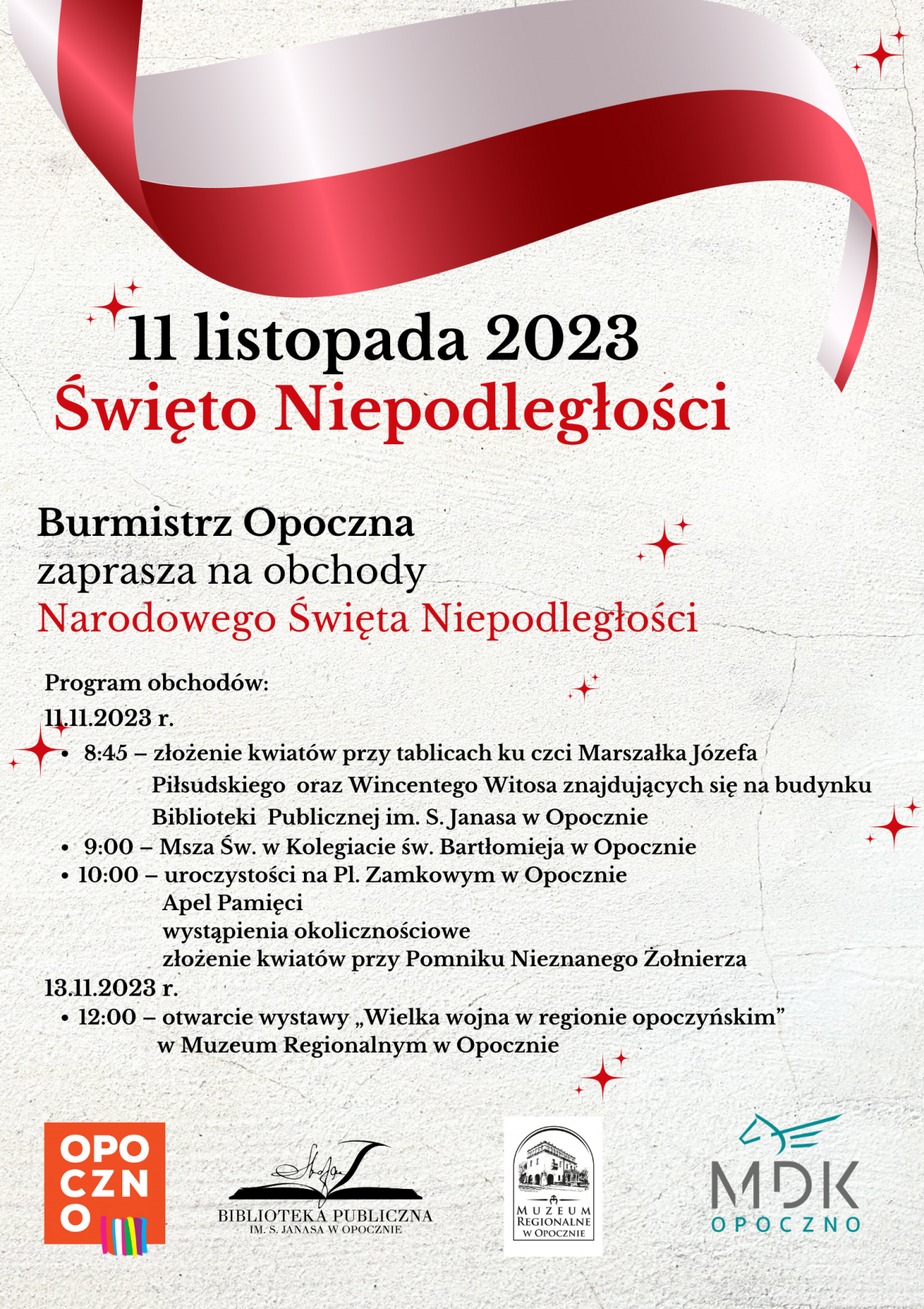 Burmistrz Opoczna Dariusz Kosno serdecznie zaprasza mieszkańców do udziału w uroczystych obchodach Narodowego Święta Niepodległości.