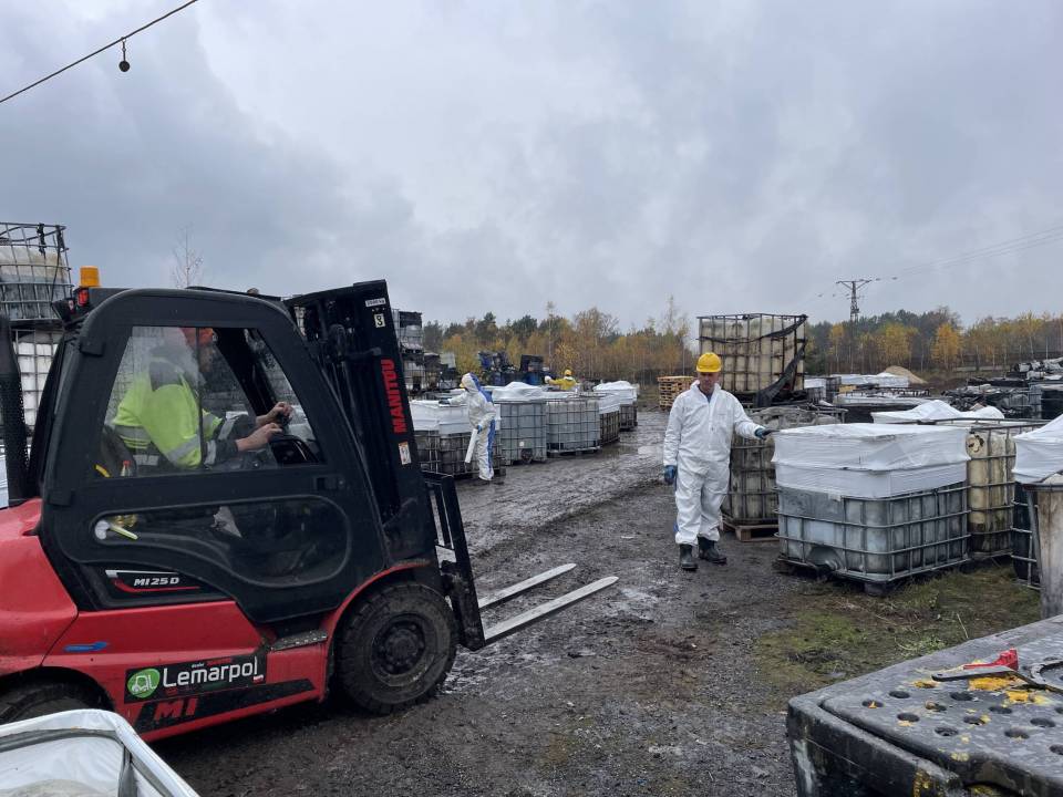 W Chabielicach rozpoczął się kolejny, kluczowy etap prac związanych z usuwaniem niebezpiecznych odpadów. W poniedziałek, 3 listopada, ze składowiska odjechało już kilka transportów z mauzerami zawierającymi substancje niebezpieczne – w momencie naszej obecności był to trzeci konwój. To początek intensywnej akcji, która ma doprowadzić do całkowitego oczyszczenia terenu.